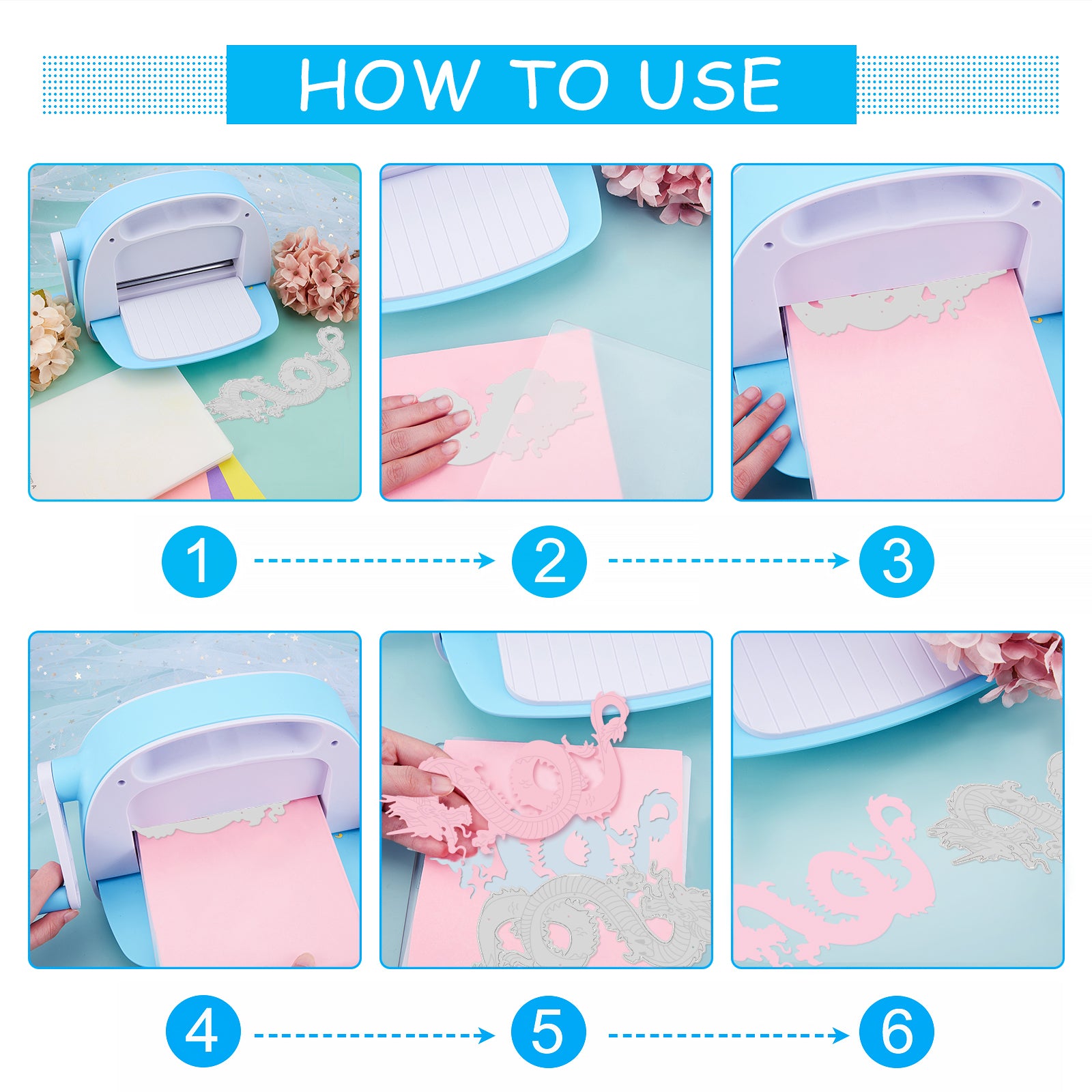 - How to Use: Taking one cutting pad and place your cut die on top. Then, place your chosen material on top of the die. Last, complete with chosen material and the second cutting pad placed on the top of the die, then it's ready to go! With one roll through your die cutting machine, your design will be revealed!