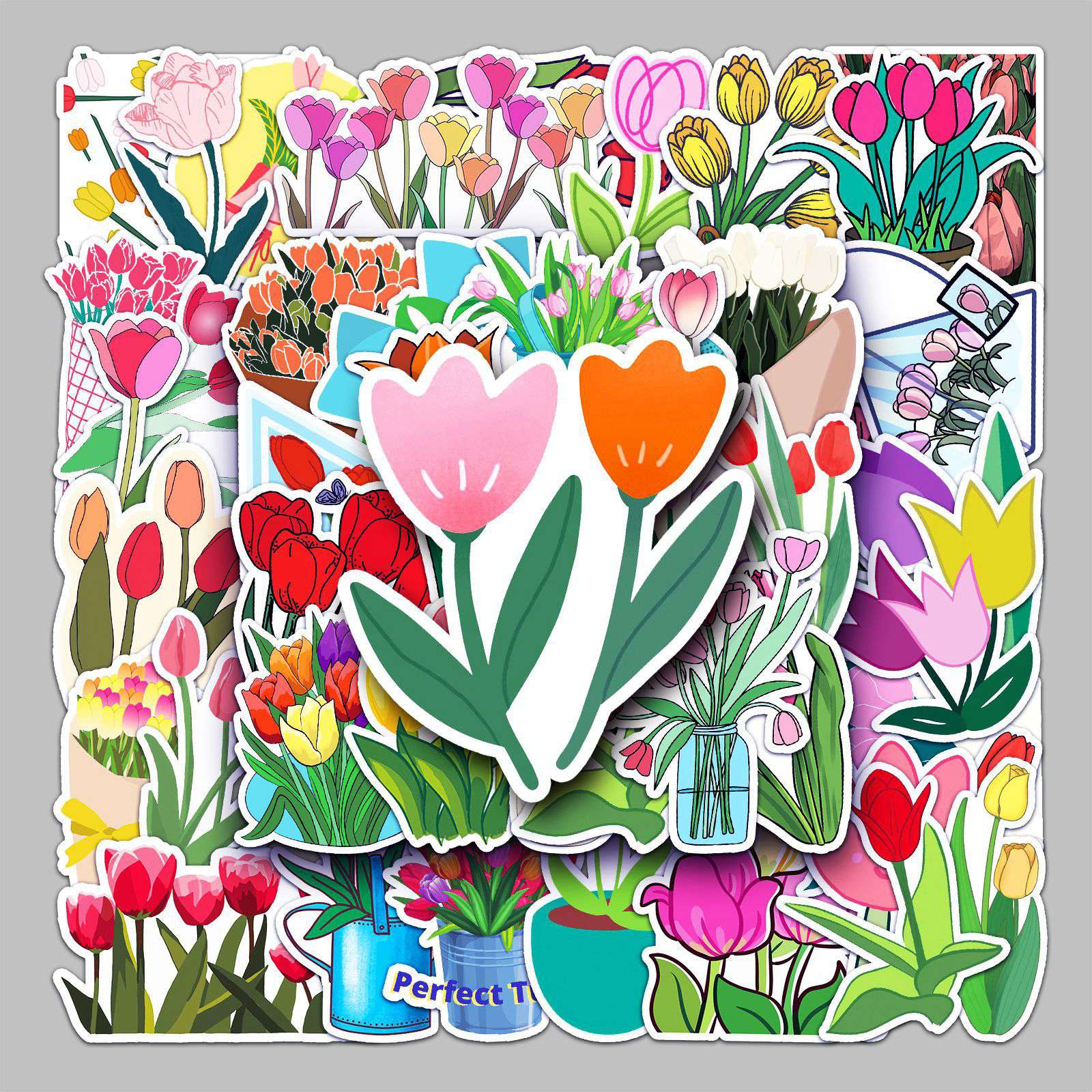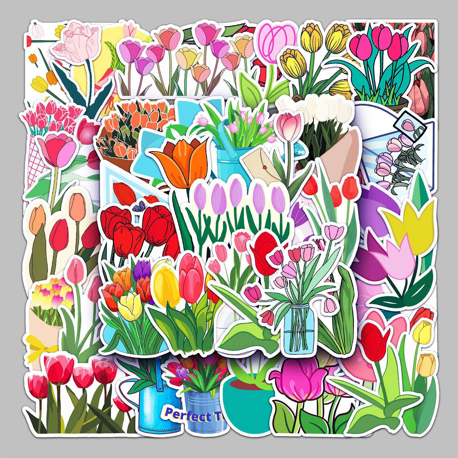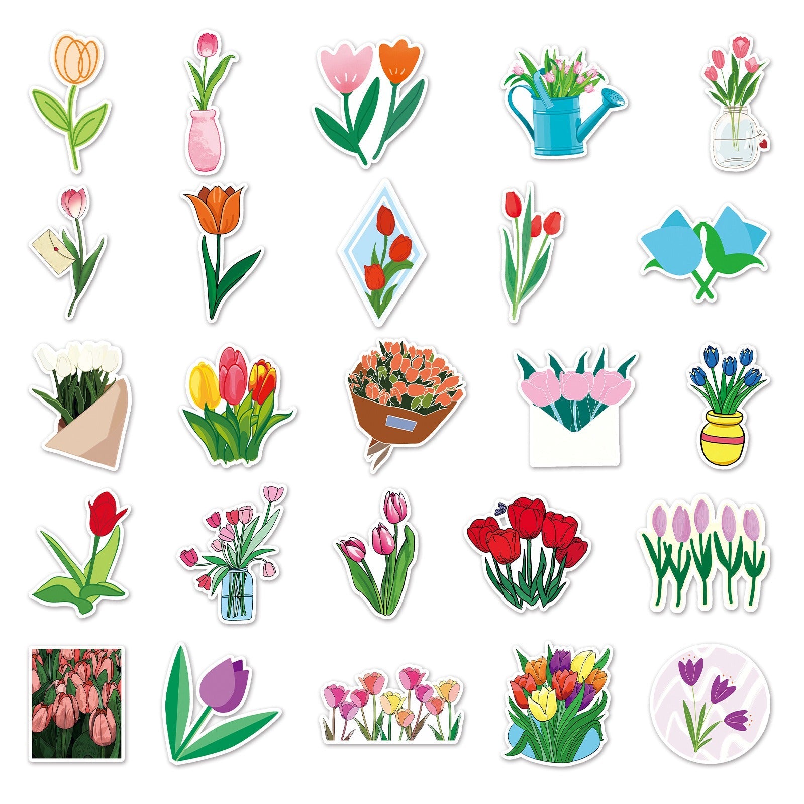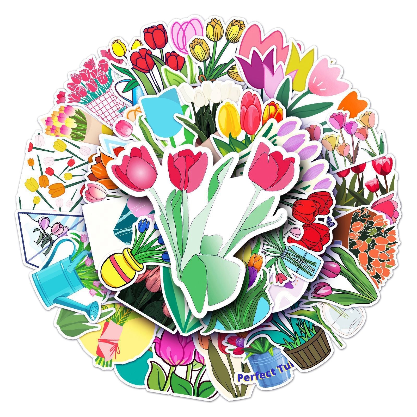 Craspire 50Pcs Tulip Pattern Waterproof PVC Plastic Scrapbook Stickers, Self Adhesive Picture Stickers, Mixed Color