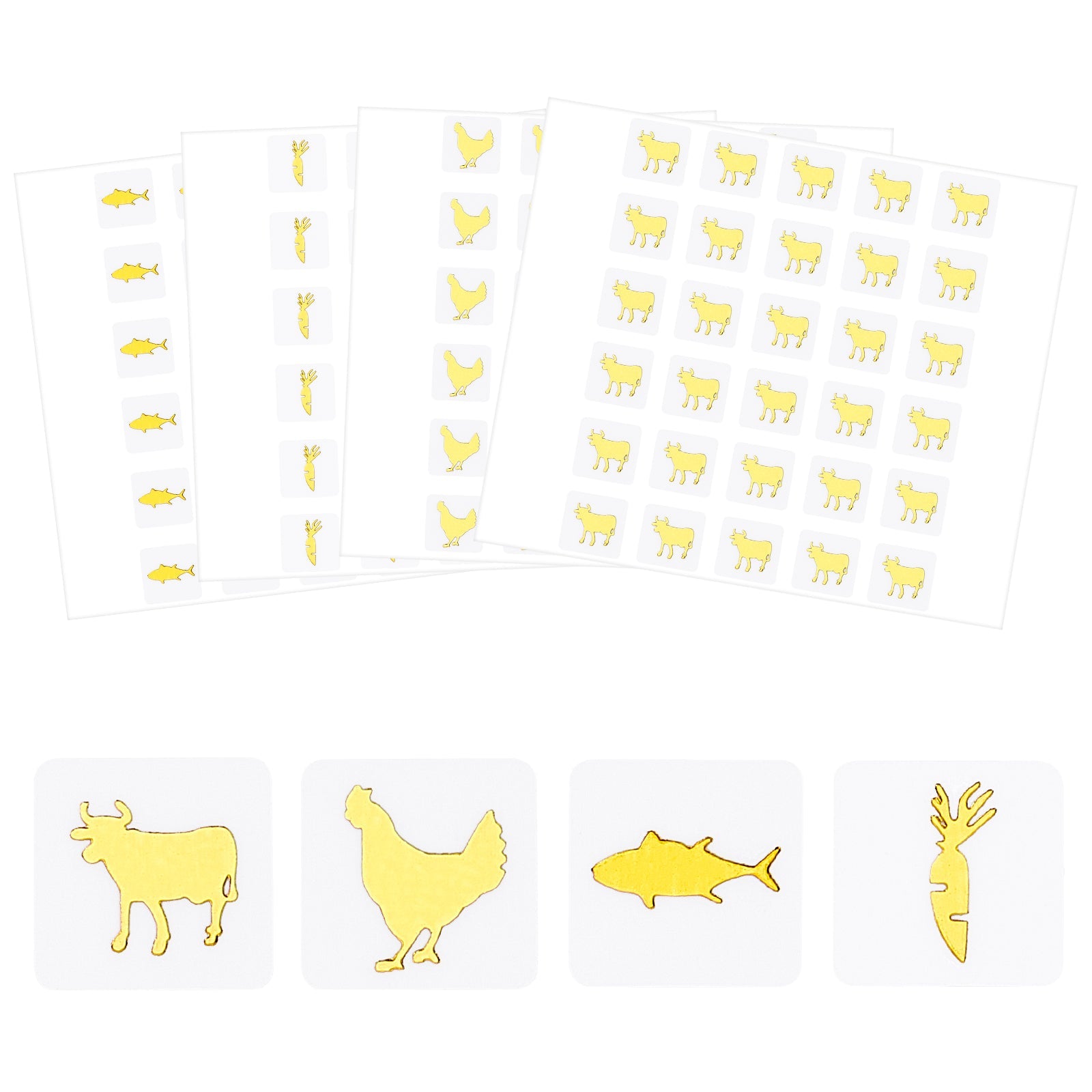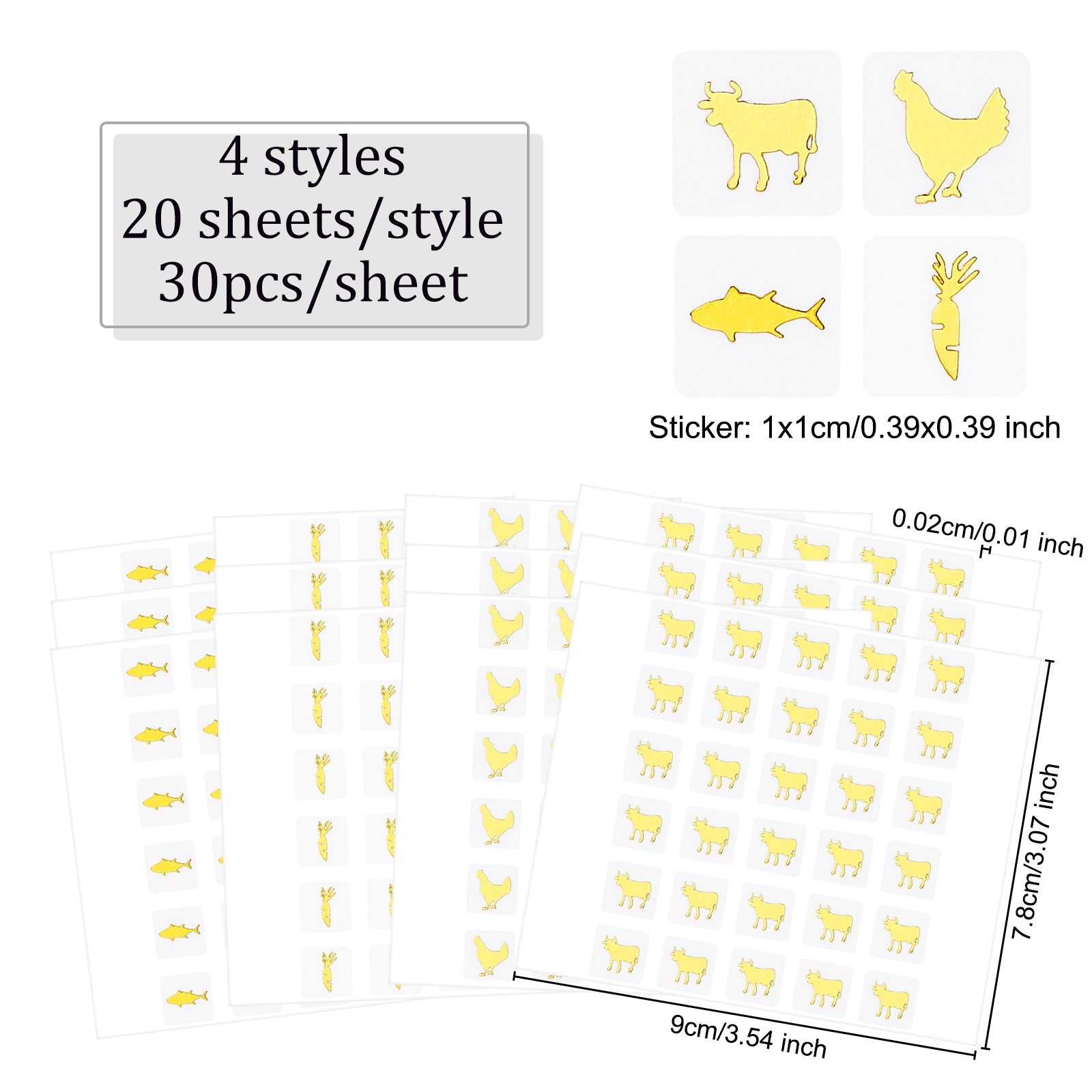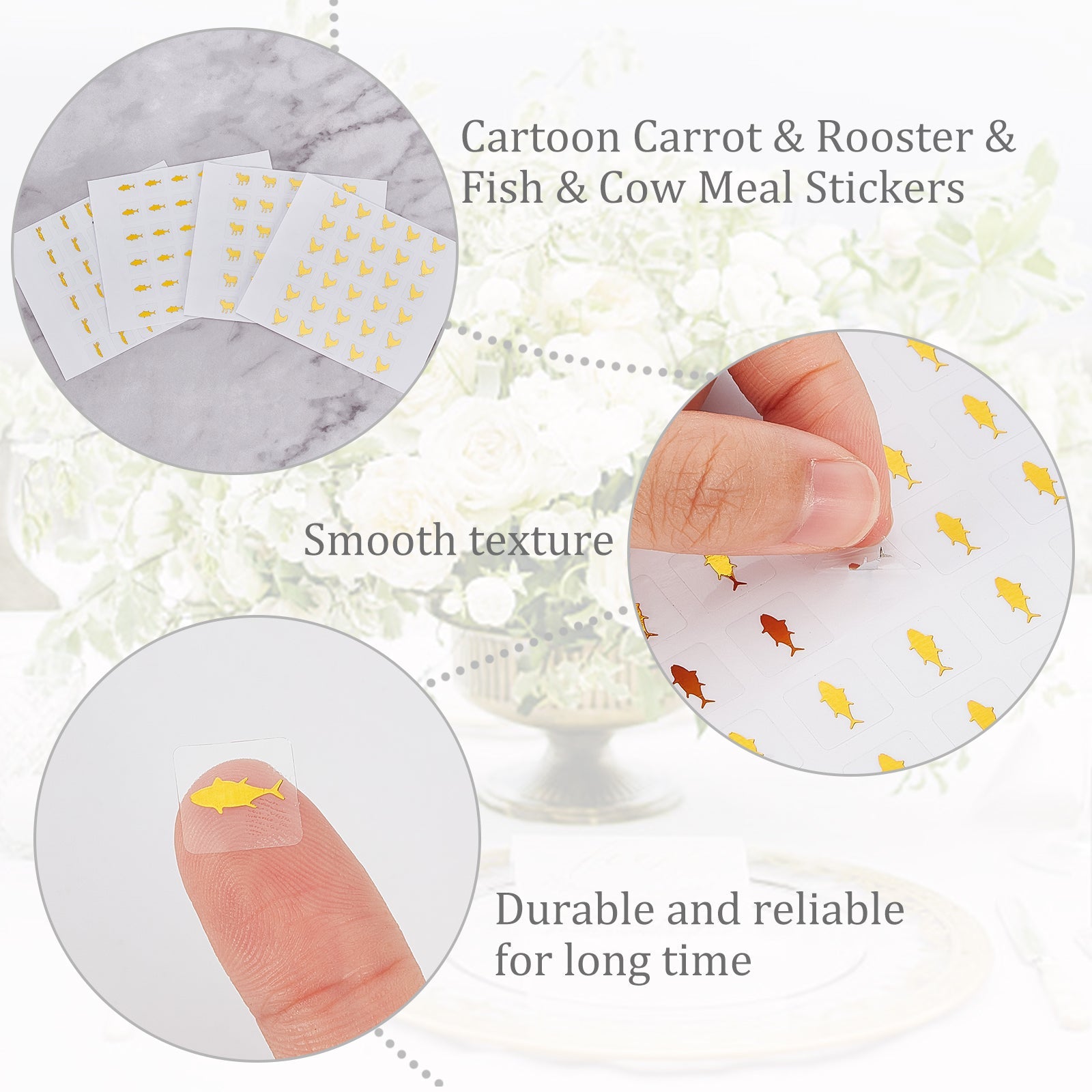 Craspire 80 Sheets 4 Style Cartoon Carrot & Rooster & Fish & Cow Meal Stickers, Adhesive Square Paper Labels, Gold, 7.8x9cm, 30pcs/sheet, 20sheets/style