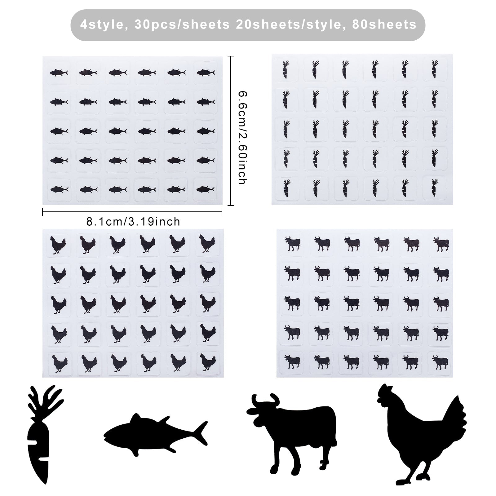 Craspire 80 Sheets 4 Style Cartoon Carrot & Rooster & Fish & Cow Meal Stickers, Adhesive Square Paper Labels, Black, 6.6x8.1x0.02cm, 30pcs/sheet, 20sheets/style