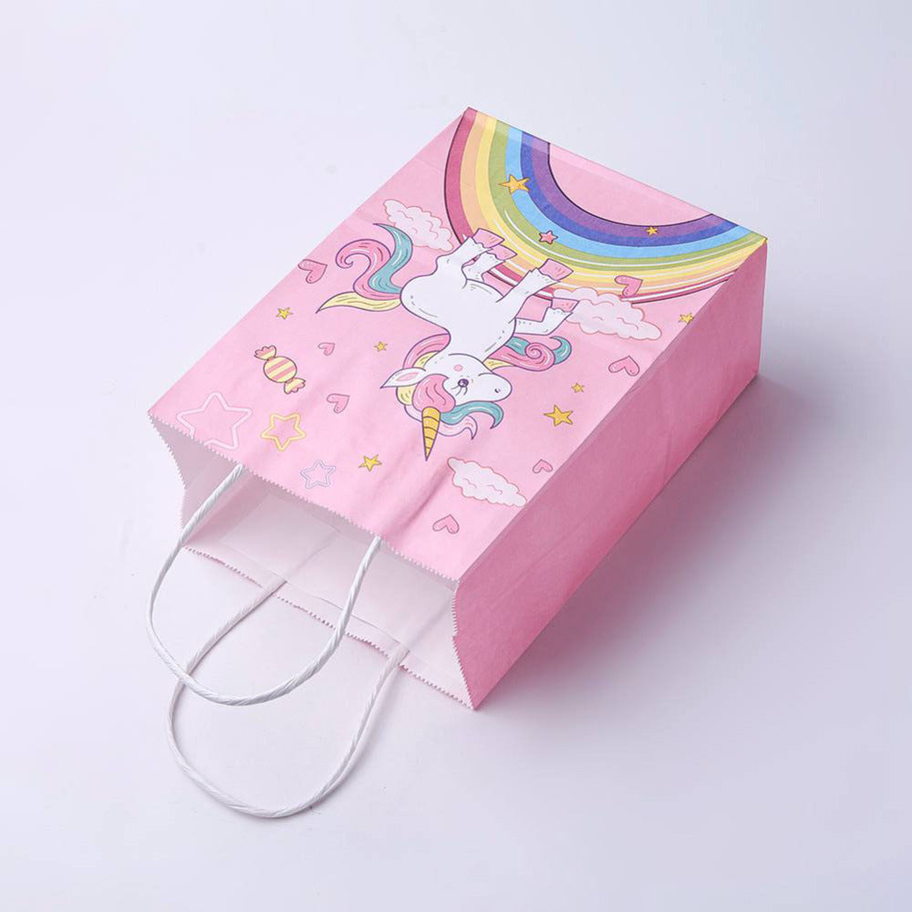 12 pc kraft Paper Bags, with Handles, Gift Bags, Shopping Bags, Rectangle, Unicorn Pattern, Pink, 21x15x8cm