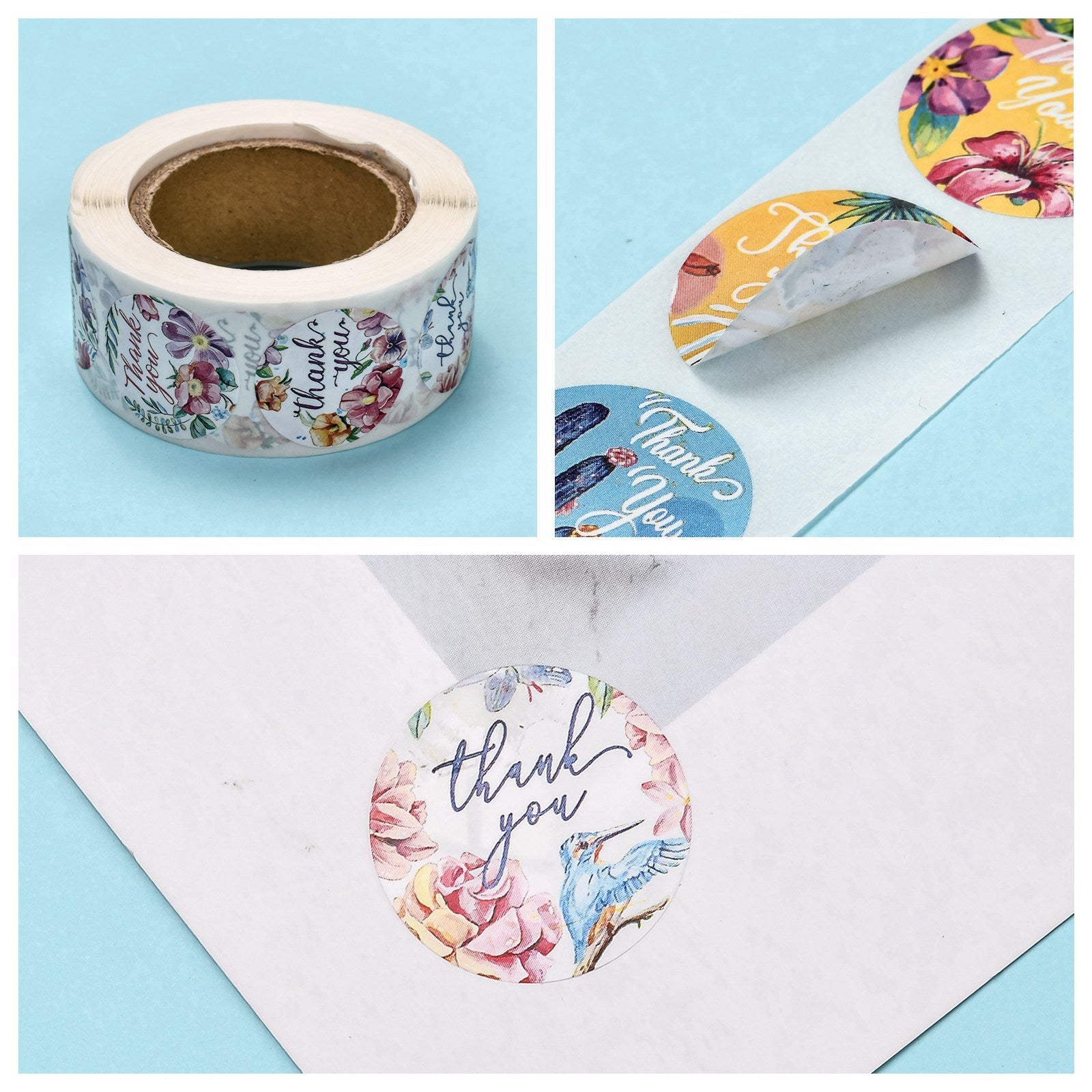 DIY Scrapbook, 1 Inch Thank You Stickers, Decorative Adhesive Tapes, Flat Round with Flower & Word Thank You, Colorful