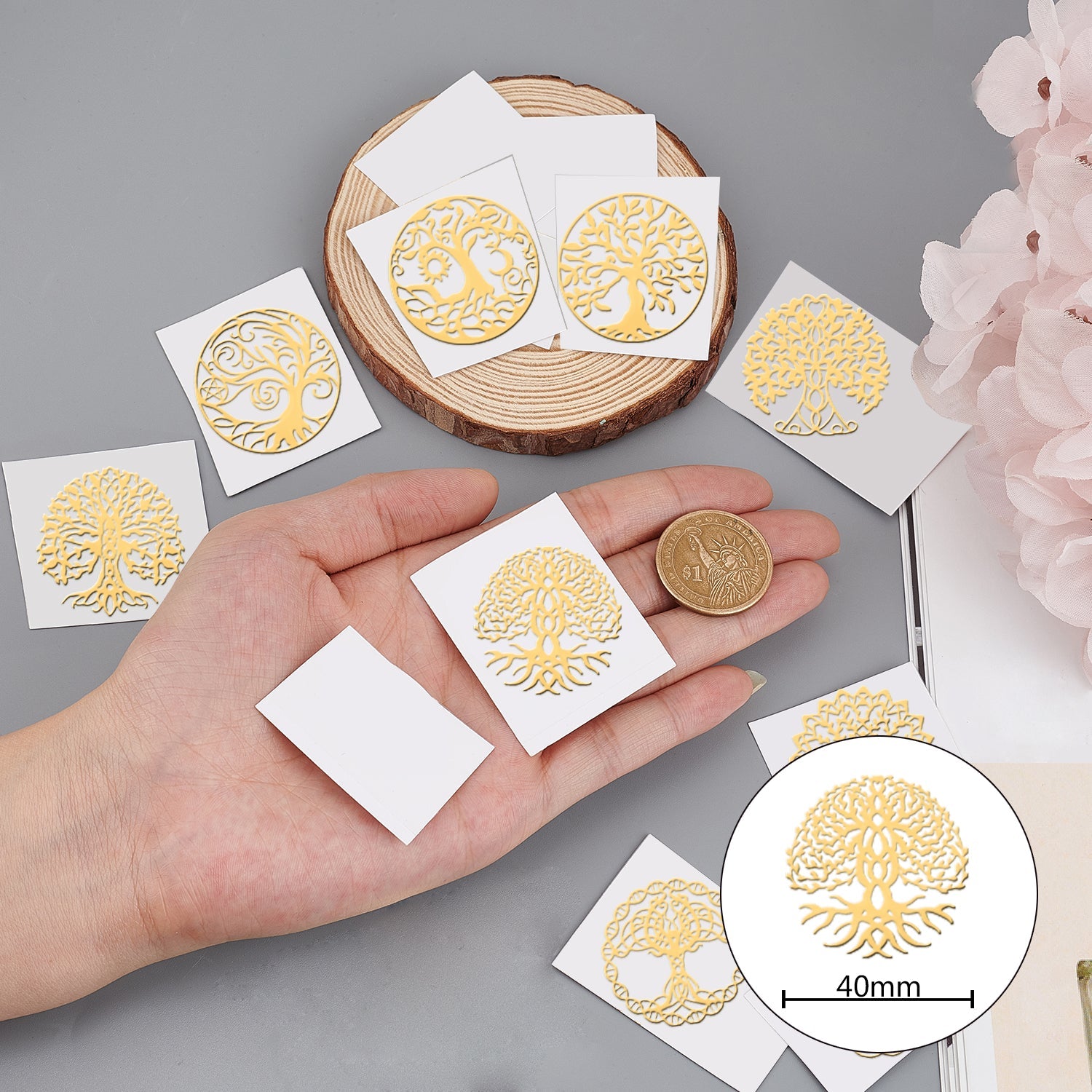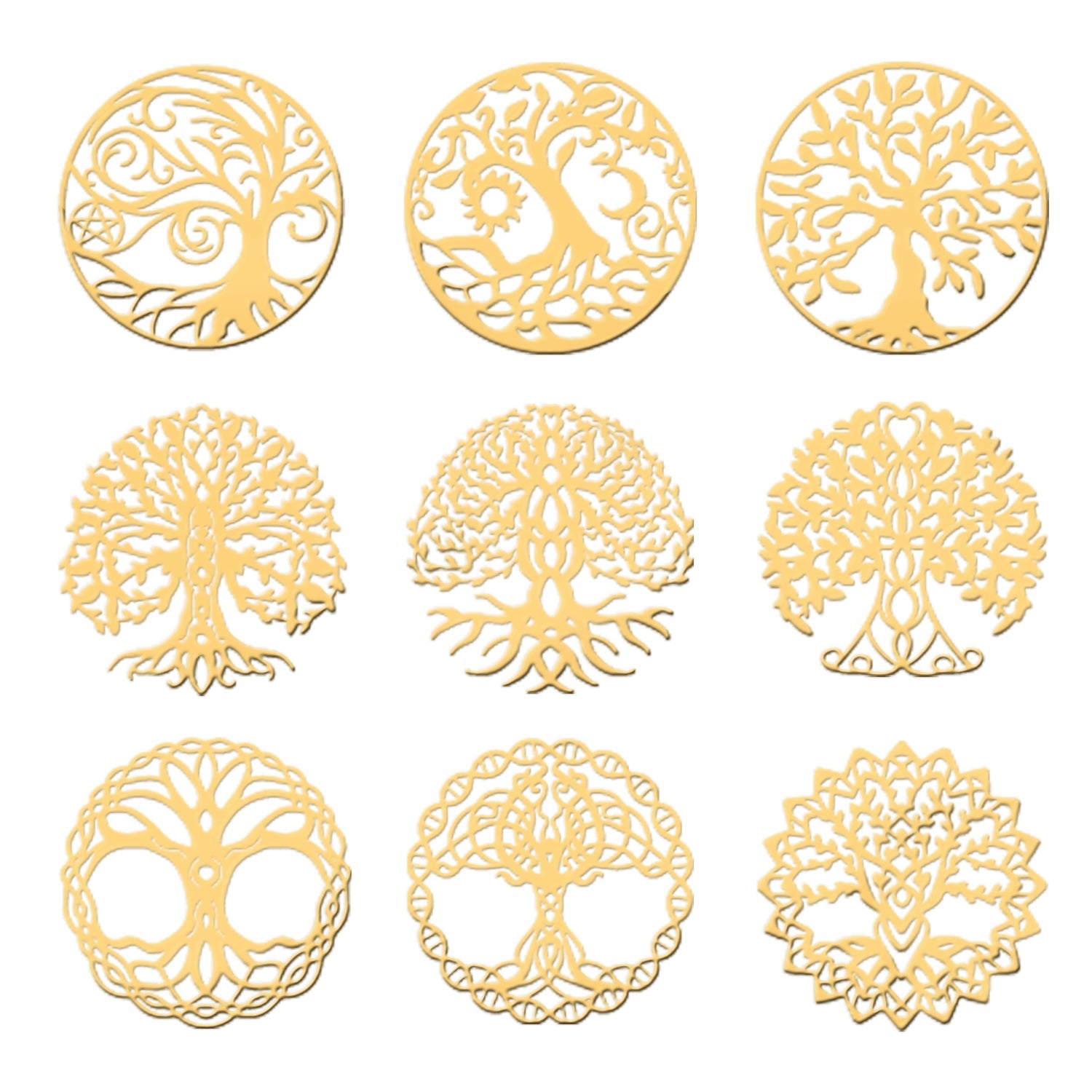 Craspire 9Pcs 9 Style Custom Carbon Steel Self-adhesive Picture Stickers, Flat Round with Mixed Patterns, Golden, Tree of Life Pattern, 40x40mm, 1pc/style