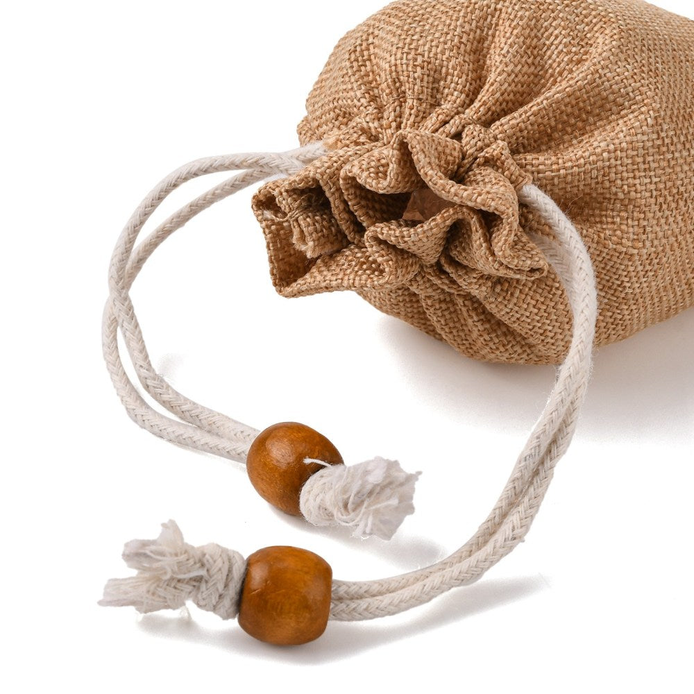 50 pc Burlap Packing Pouches, Drawstring Bags, with Wood Beads, Bisque, 10~10.1x8.2~8.3cm