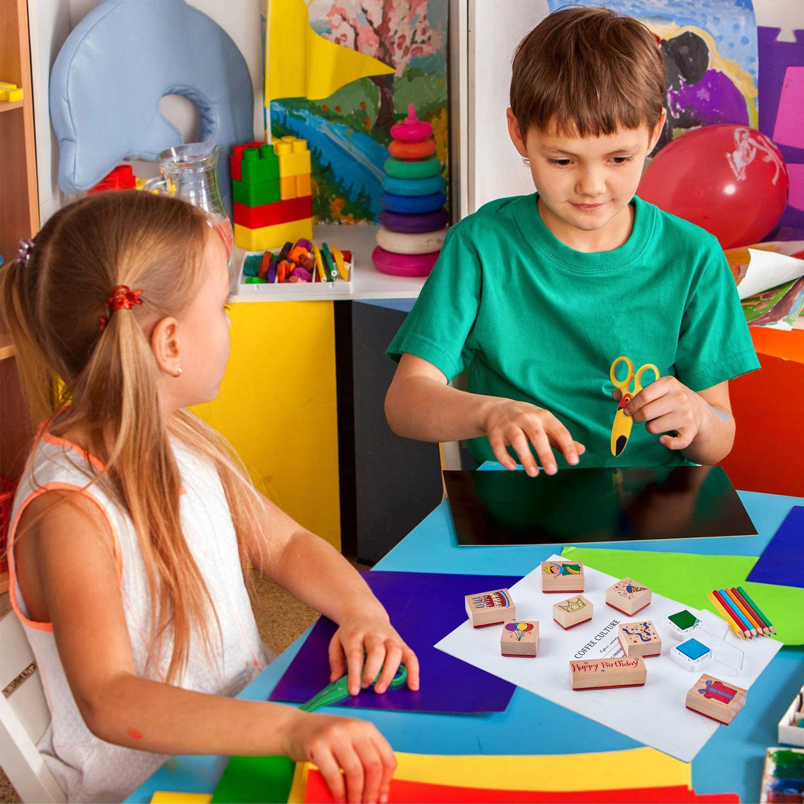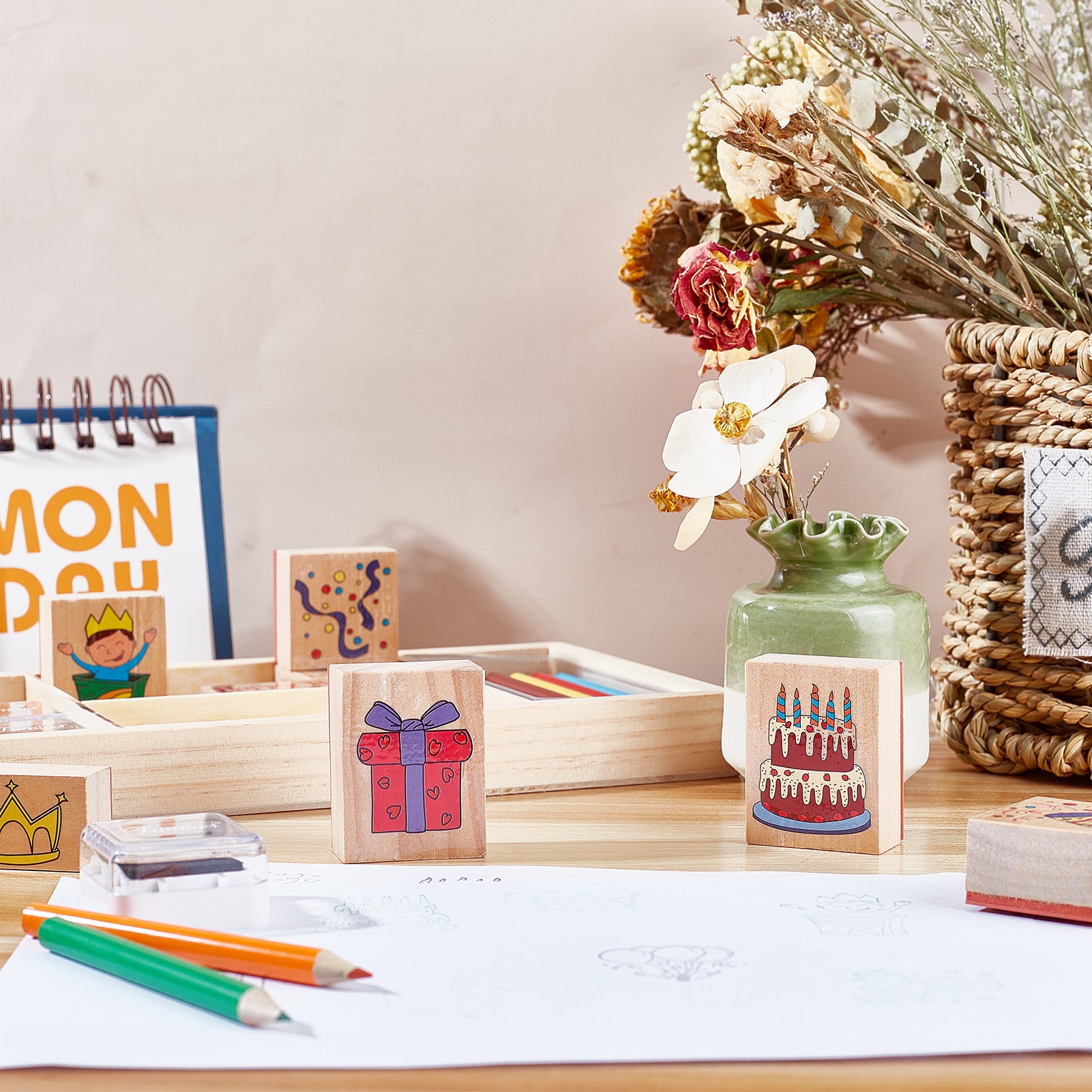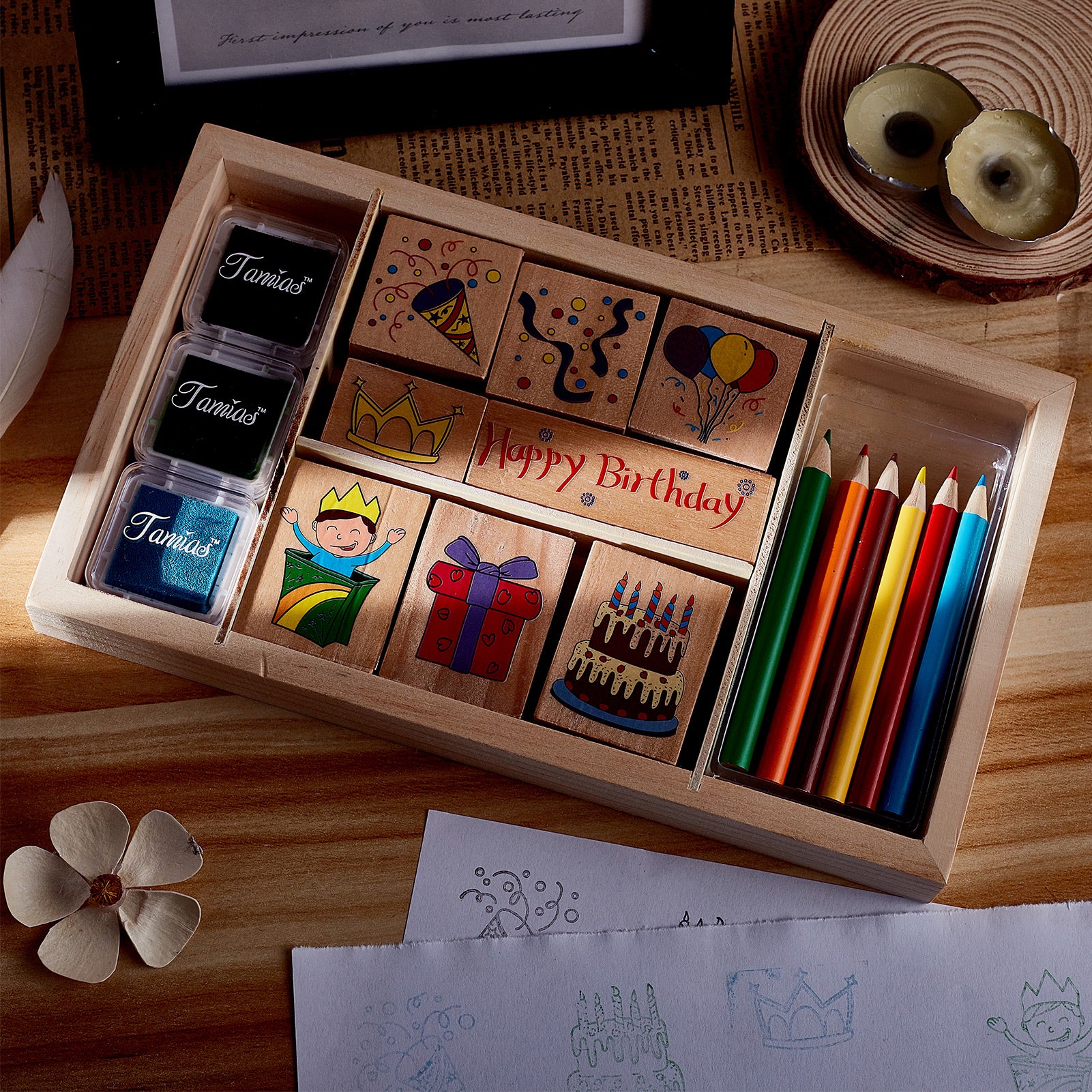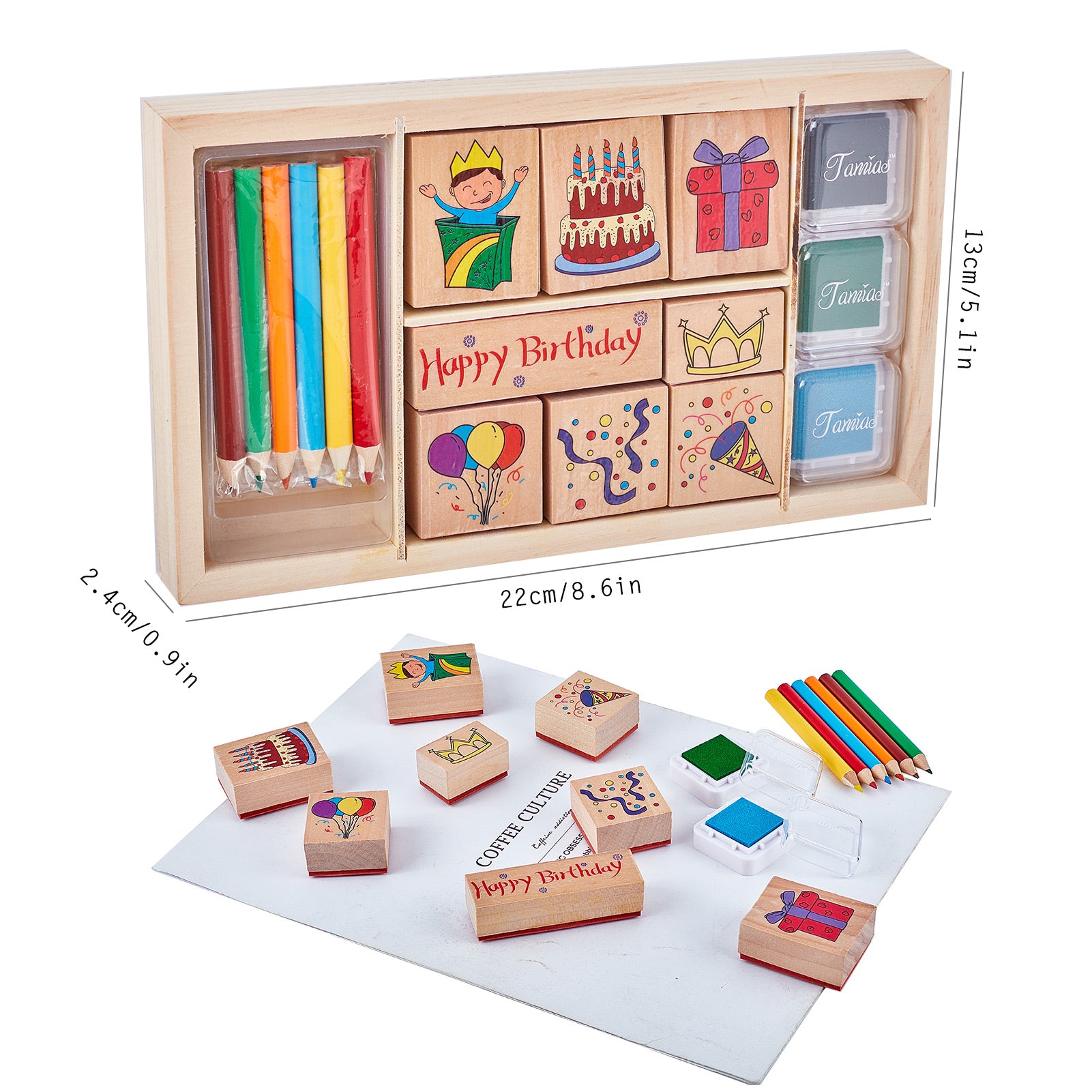 - PACKAGE INCLUDES: 8pcs happy birthday theme wooden rubber stamps, 3pcs inkpad, 5pcs color pencil