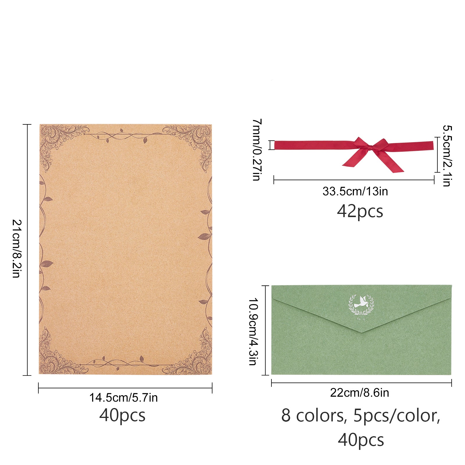 - STATIONERY WRITING PAPER WITH ENVELOPES: You will receive 40 gilding kraft writing paper and 40 paper envelopes, plus 6 colors x 7strand/color bowknot polyester satin ribbon. Adequate amount and style to meet your daily needs
