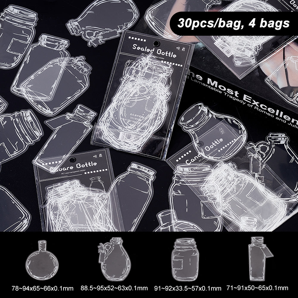 Craspire 4 Bags 4 Styles PET Adhesive Waterproof Stickers Set, Transparent Bottle Decorative Stickers for DIY Scrapbook, Mixed Shapes, Clear, Bottle Pattern, 71~95x33.5~66x0.1mm, about 30pcs/bag, 1 bag/style