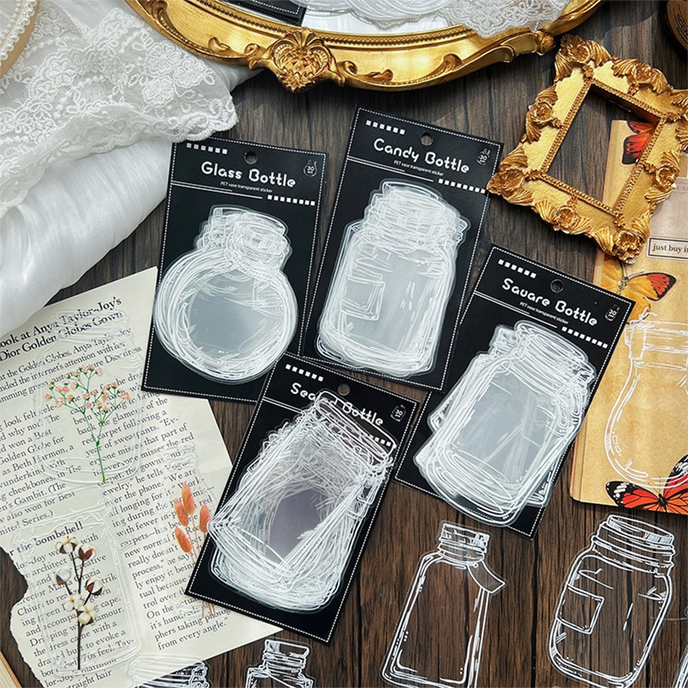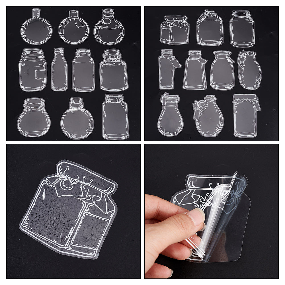 Craspire 4 Bags 4 Styles PET Adhesive Waterproof Stickers Set, Transparent Bottle Decorative Stickers for DIY Scrapbook, Mixed Shapes, Clear, Bottle Pattern