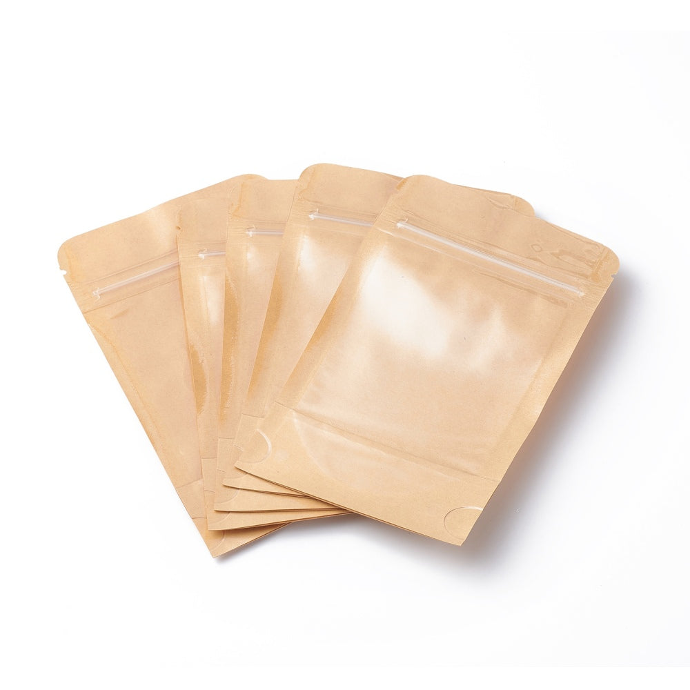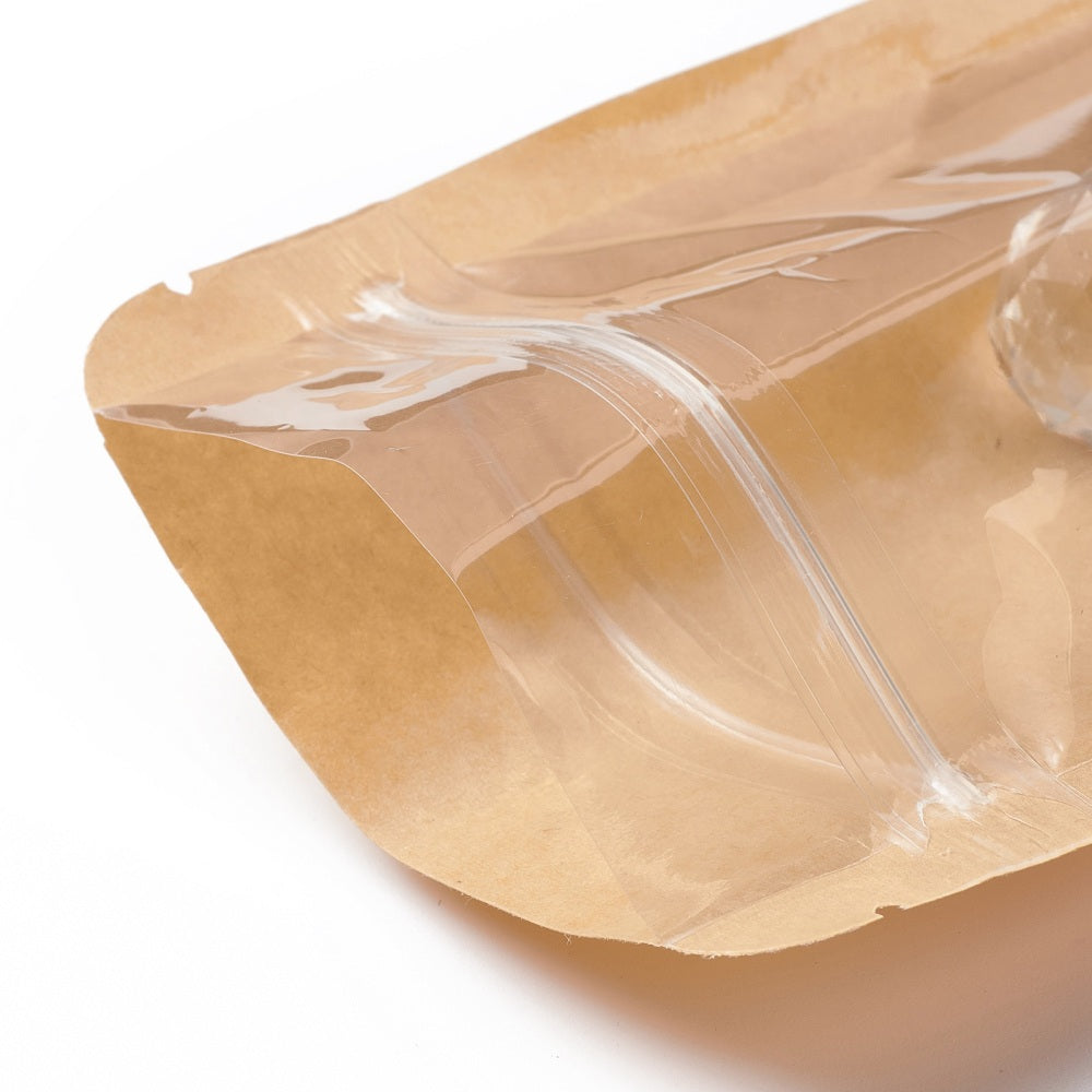 500 pc Eco-friendly Biodegradable Kraft Paper Packaging Zip Lock Paper Bag, Stand up Pouch, with Windows, Rectangle, Dark Khaki, 14x9cm