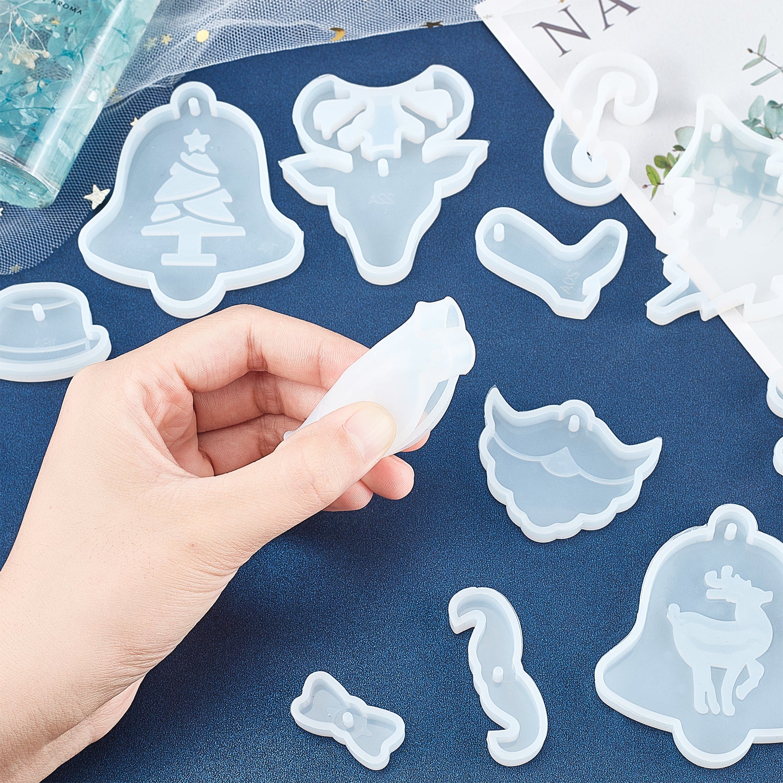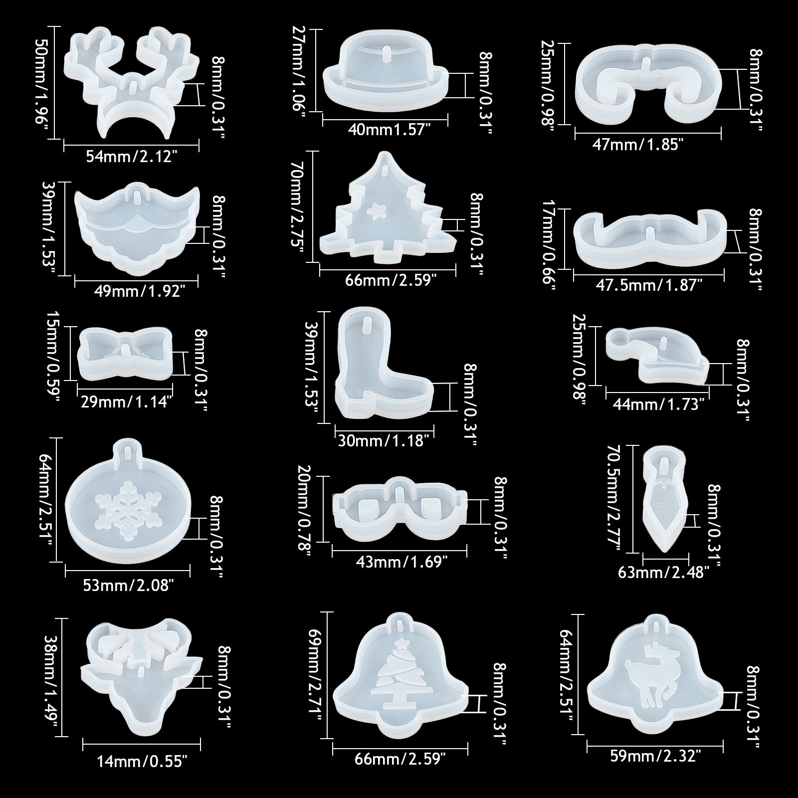 • Size: Silicone Mold, Antlers: 50x54x8mm, 1pc; Silicone Mold, Hat: 27x40x8mm, 1pc; Silicone Mold, Mustache: 25x47x8mm, 1pc; Silicone Mold, Christmas Mustache: 39x49x8mm, 1pc; Silicone Mold, Christmas Bell: 70x66x8mm, 1pc.