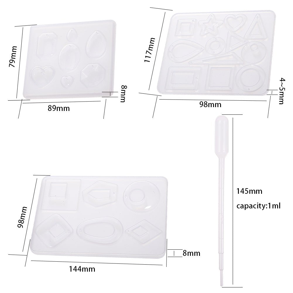 • Size: Molds: 14.4x9.8x0.8cm, 1pc; Molds: 117x98x4~5mm, 1pc; Molds: 79x89x8mm; Inner: 10~29mm, 1pc; Pipettes: 145x11.5mm; capacity: 1ml, 10pcs; Earring Hook: 19mm, Hole: 1.5mm; Pin: 0.7mm, 30pcs; Jump Ring: 8x0.7mm; about 6.6mm inner diameter, 50pcs.