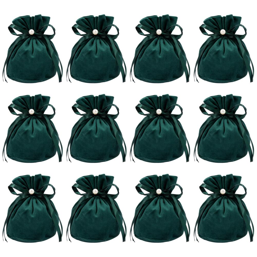 12 pc Velvet Jewelry Bags with Drawstring & Plastic Imitation Pearl, Velvet Cloth Gift Pouches, Dark Green, 13.2x14x0.4cm