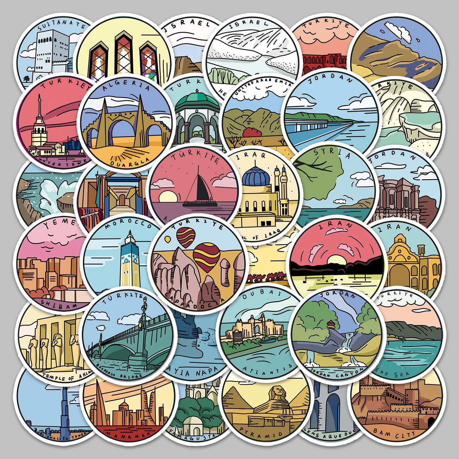 Craspire Travel Theme Round Dot PVC Scenery Sticker Rolls, Waterproof Tourist Attractions Decals for Suitcase, Skateboard, Refrigerator, Helmet, Mobile Phone Shell, Building Pattern
