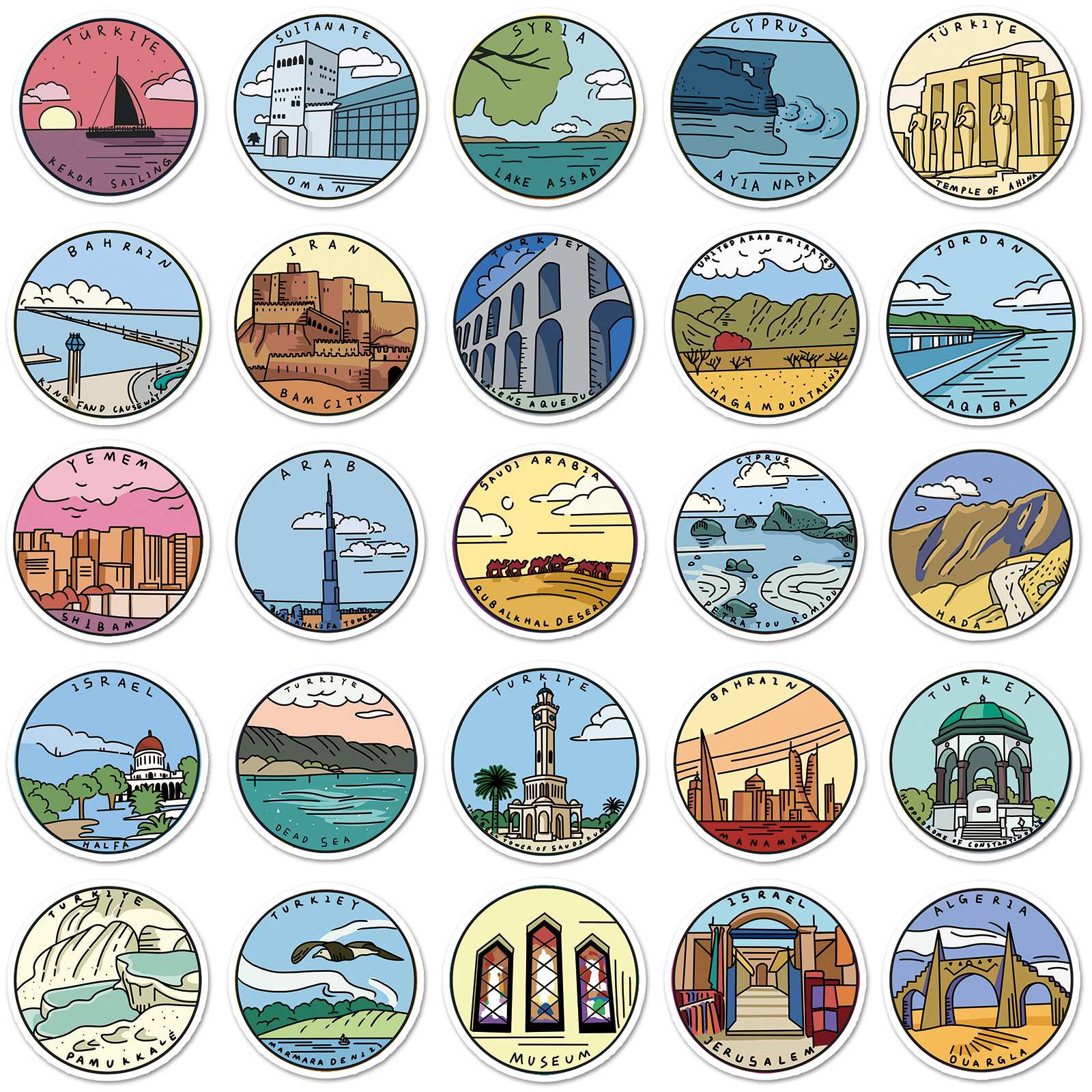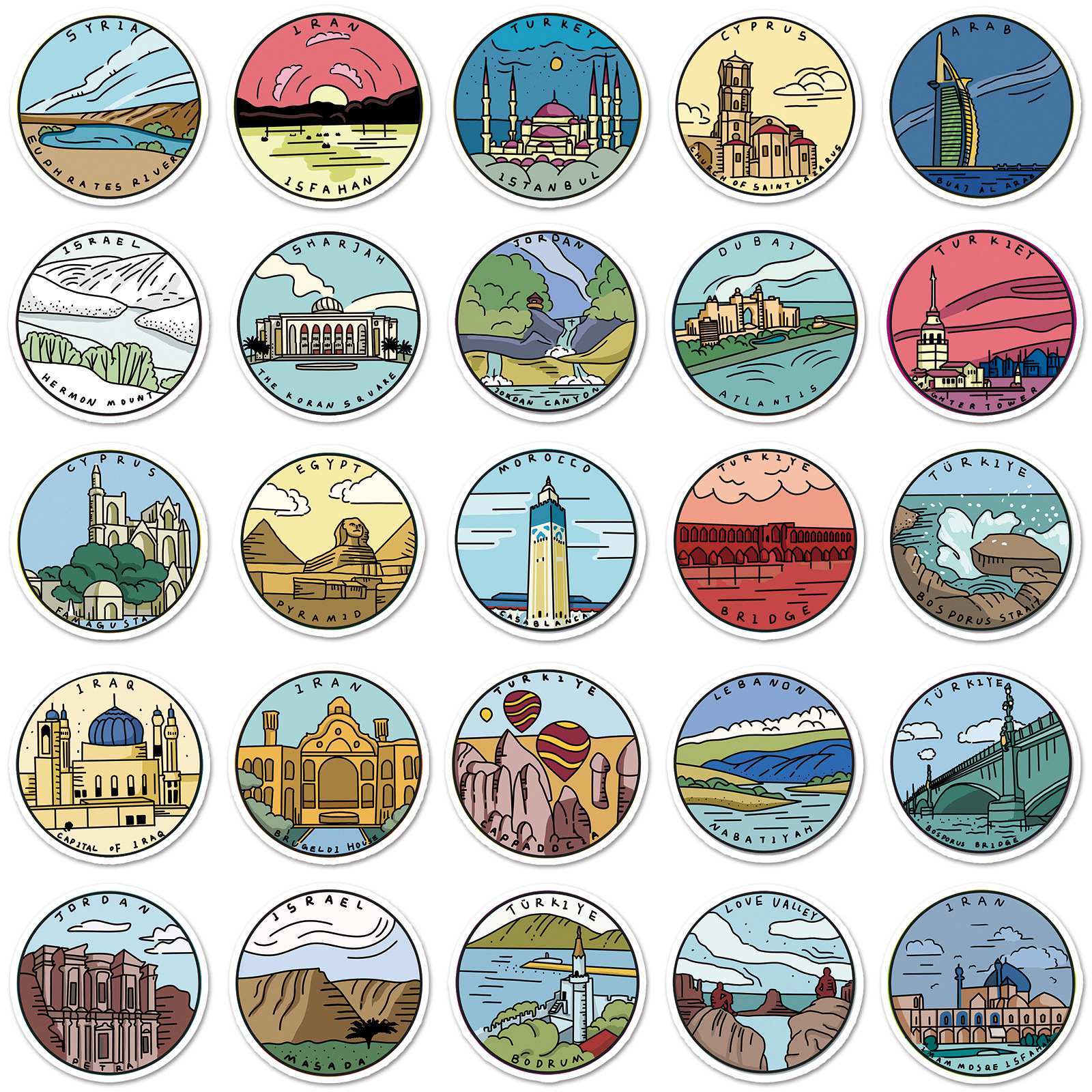 Craspire Travel Theme Round Dot PVC Scenery Sticker Rolls, Waterproof Tourist Attractions Decals for Suitcase, Skateboard, Refrigerator, Helmet, Mobile Phone Shell, Building Pattern, 55~85mm, 50pcs/bag