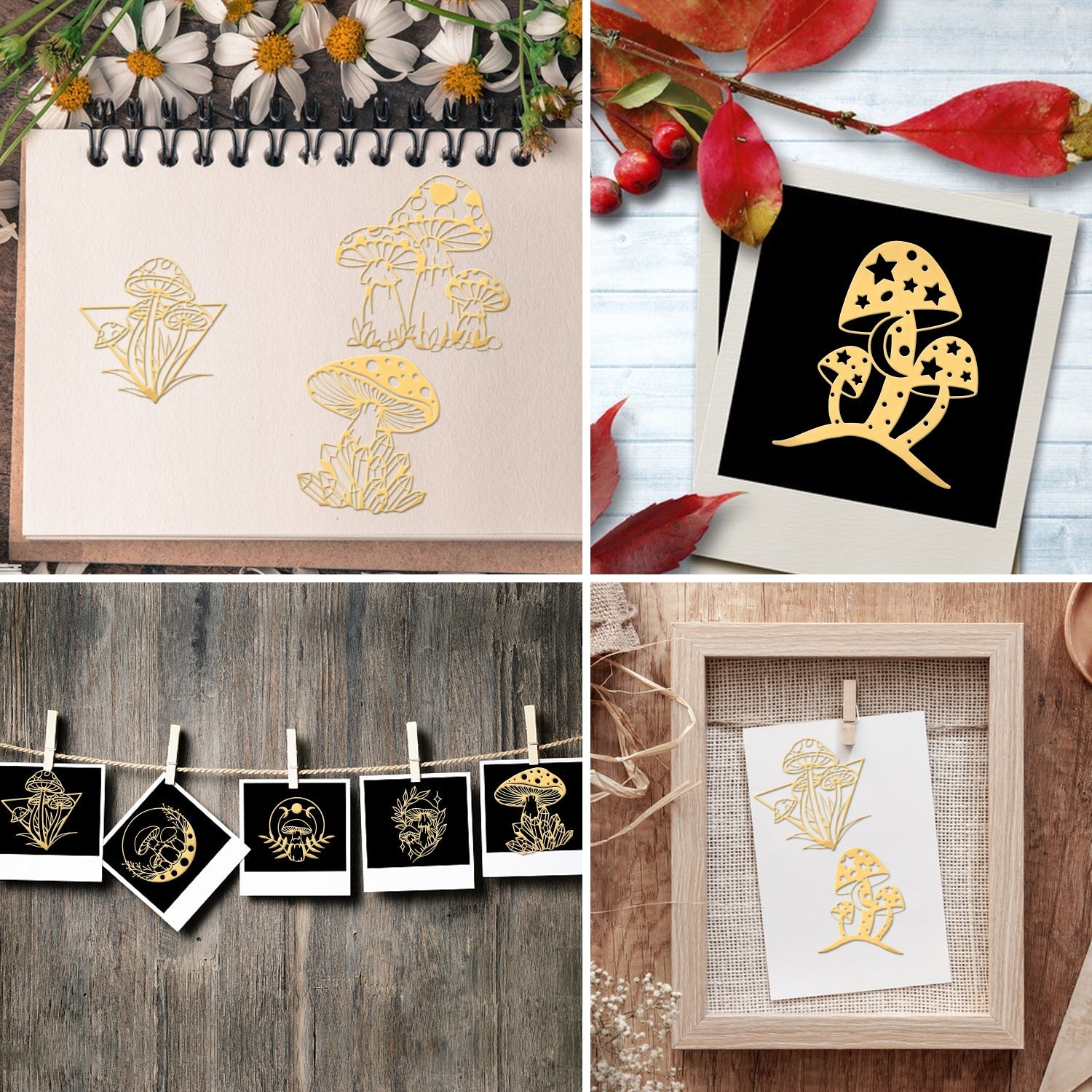 9Pcs 9 Styles Custom Carbon Steel Self-adhesive Picture Stickers, Golden, Mushroom Pattern