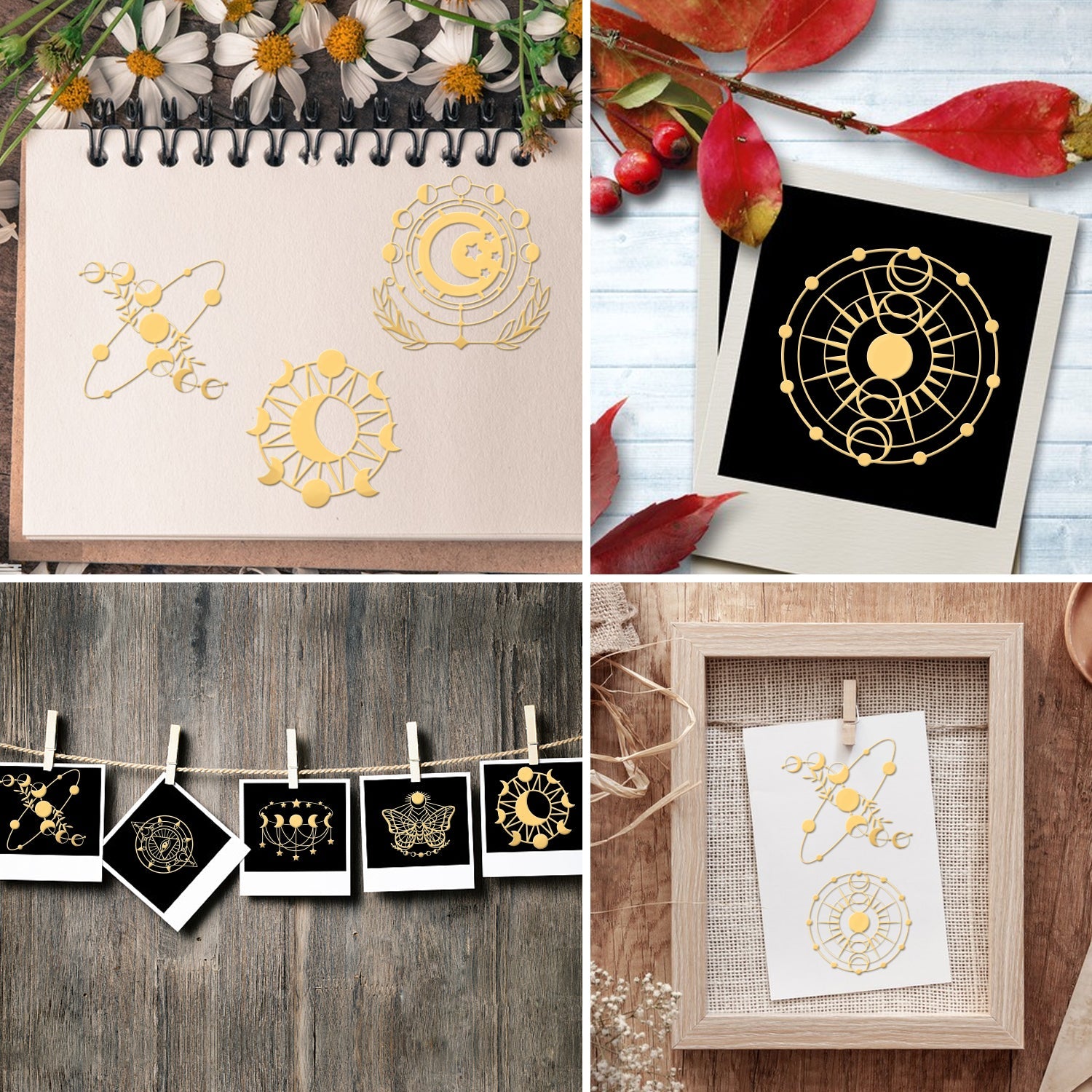 Craspire 9Pcs 9 Styles Custom Carbon Steel Self-adhesive Picture Stickers, Golden, Moon Pattern, 40x40mm, 1pc/style