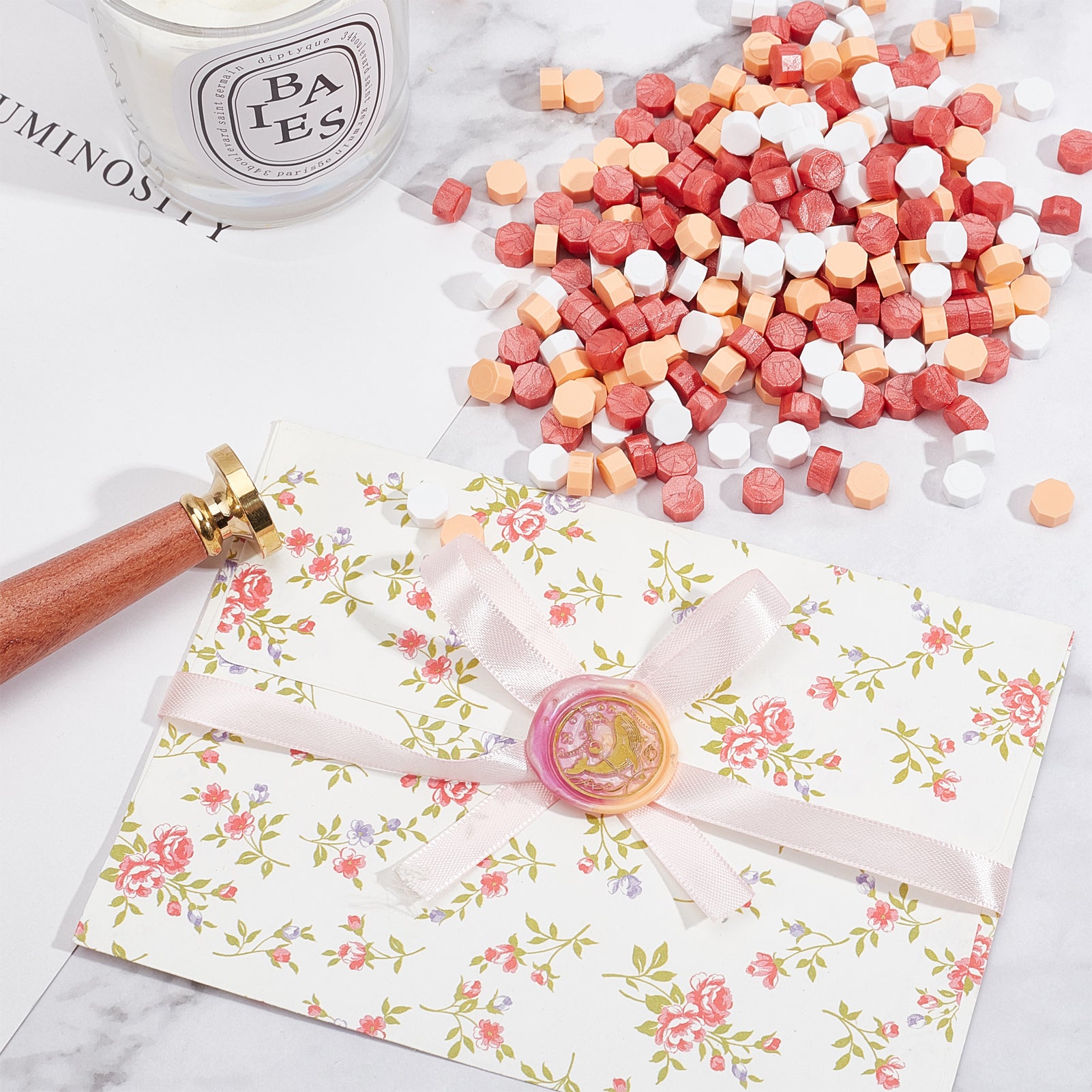 - Package includes: 300 pieces wax seal beads packed in bottle. 3 pieces can make a perfect 25mm wax stamp.