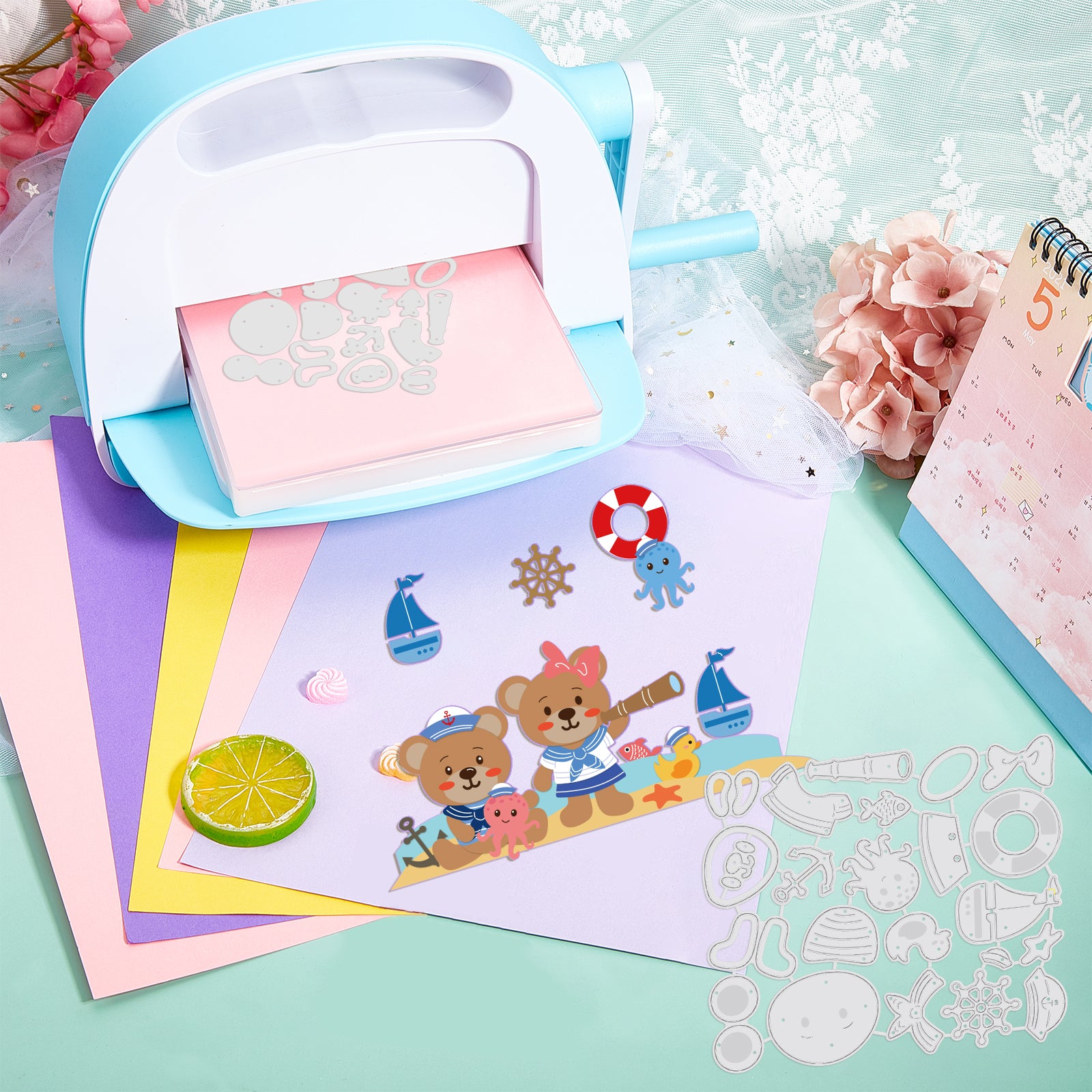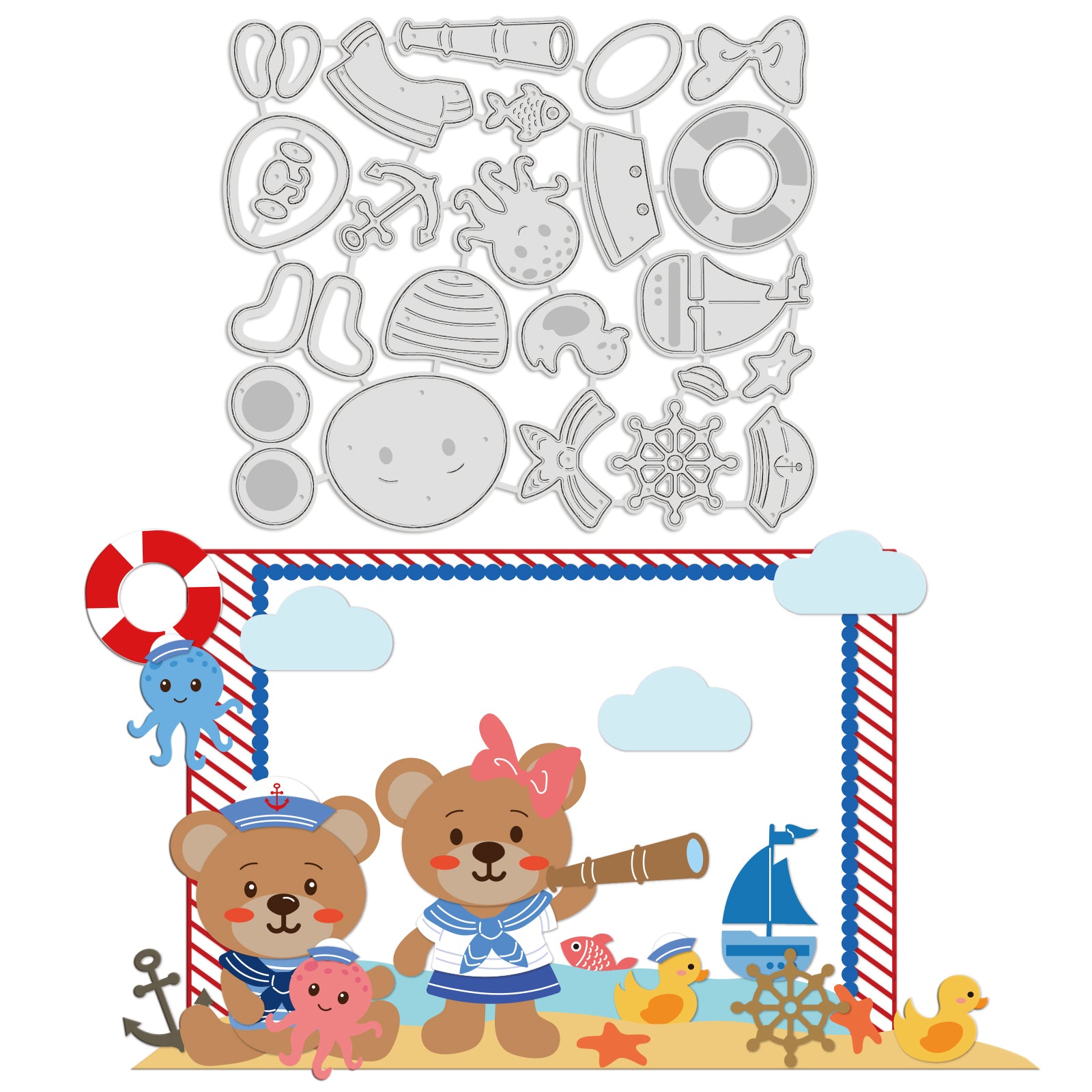- Sailor Bear Theme: Elements of the cut die include bear, octopus, boat, starfish, telescope, etc., cute and interesting. Paste it into your scrapbook and add some fun to it.