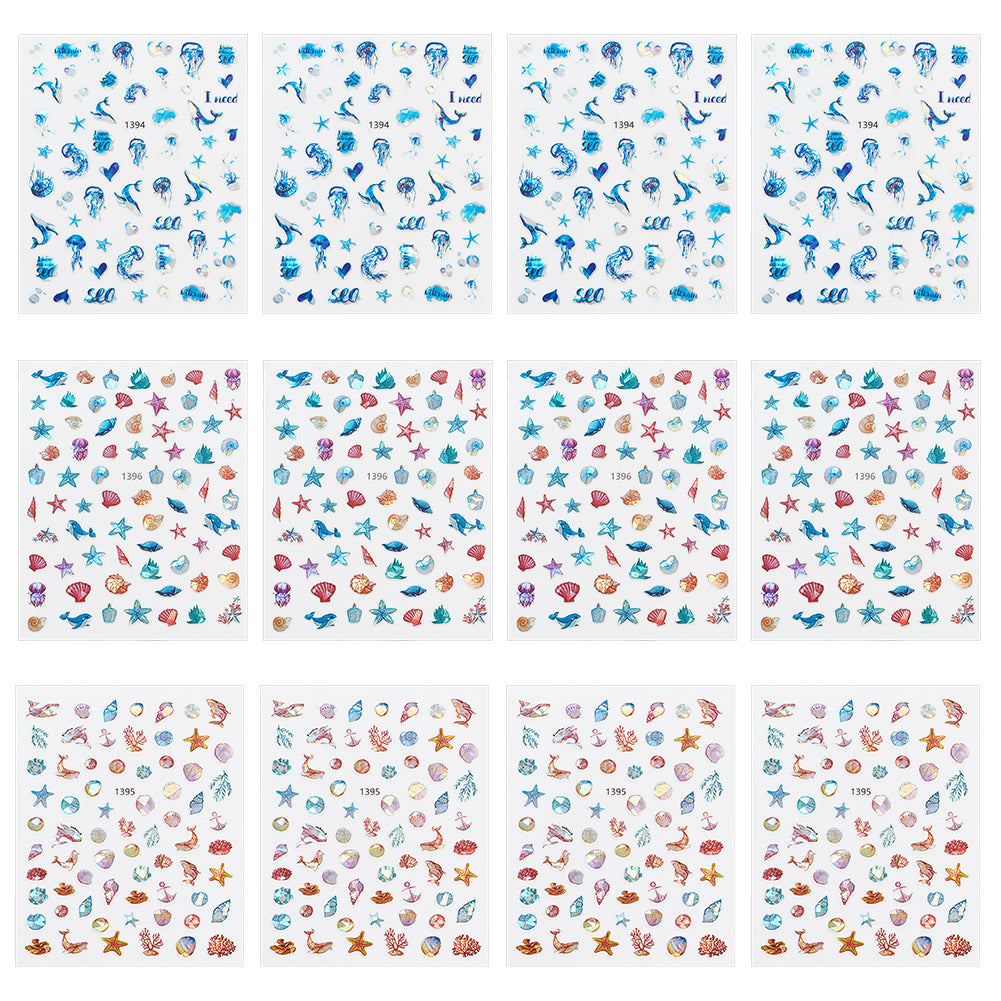 Craspire 12 Sheets 3 Style Waterproof Ocean Theme PET Nail Art Stickers, Self-adhesive, for DIY Nail Decals Design Manicure Decor, Mixed Color, 133x83x0.5mm, 4sheets/style